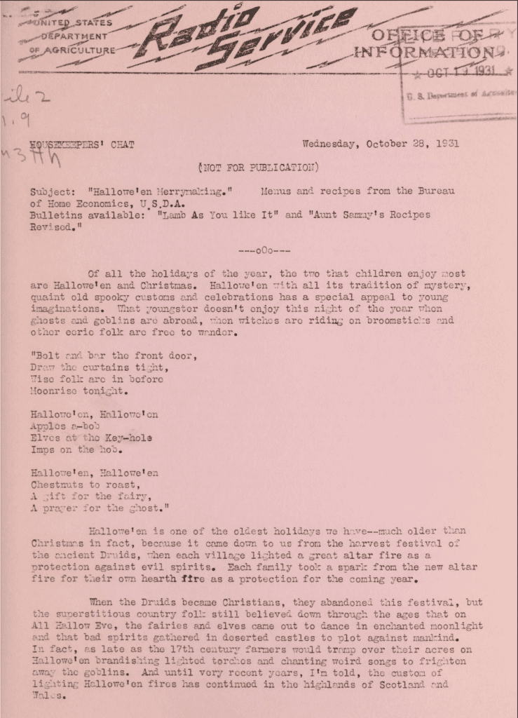 This appears to be an internal newsletter sharing Hallowe’en history and recipes within the U.S. Department of Agriculture. Read the whole document at Archive.org.