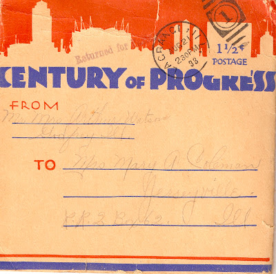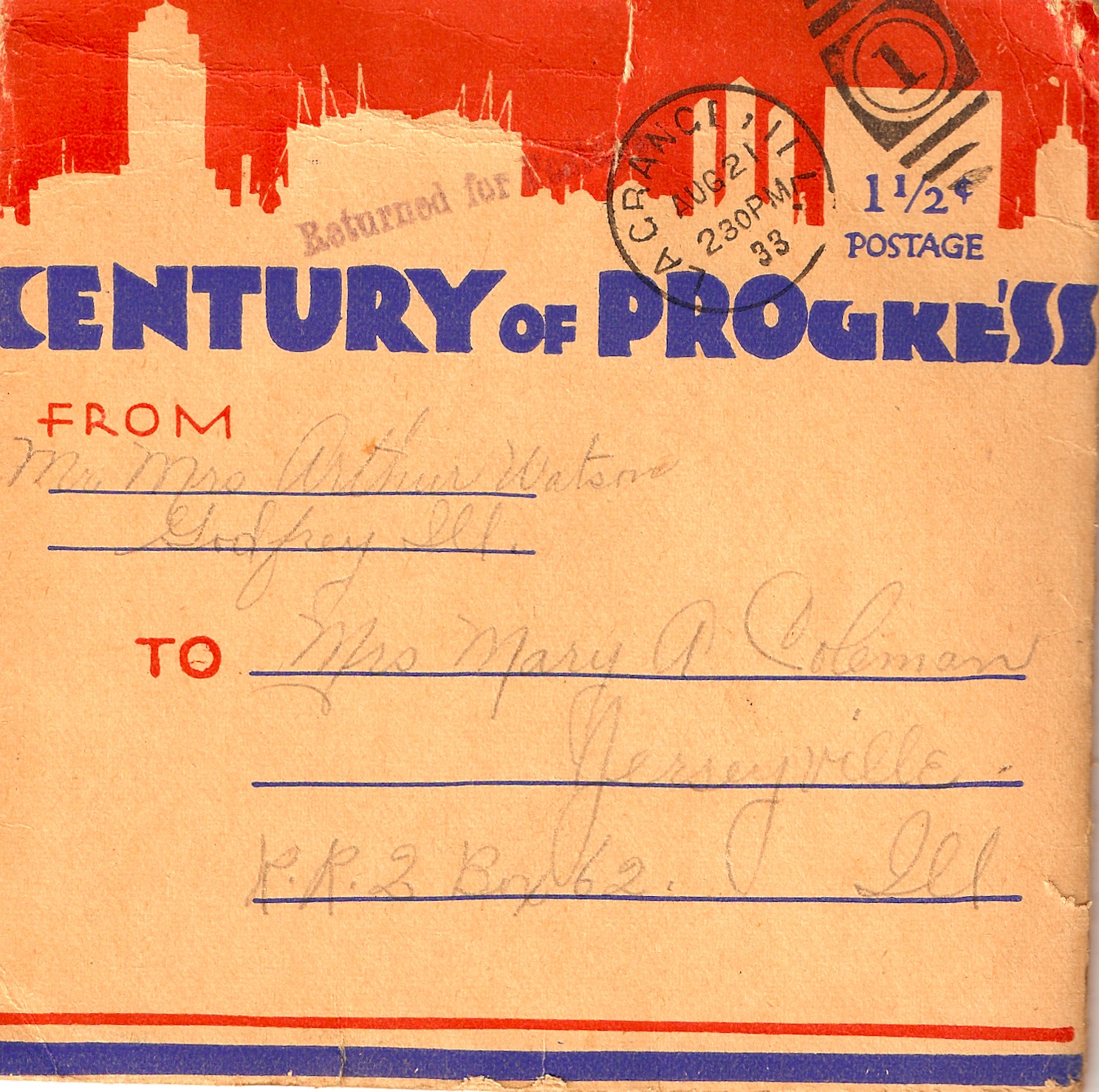 Chicago was home to both the 1893 World’s Fair (Grand Columbain Exhibition) and the 1933 World’s Fair.  This envelope with a letter was sent from the fair to someone at home.  The letter was written on a single, long sheet of paper and the illustrations were hand-drawn.